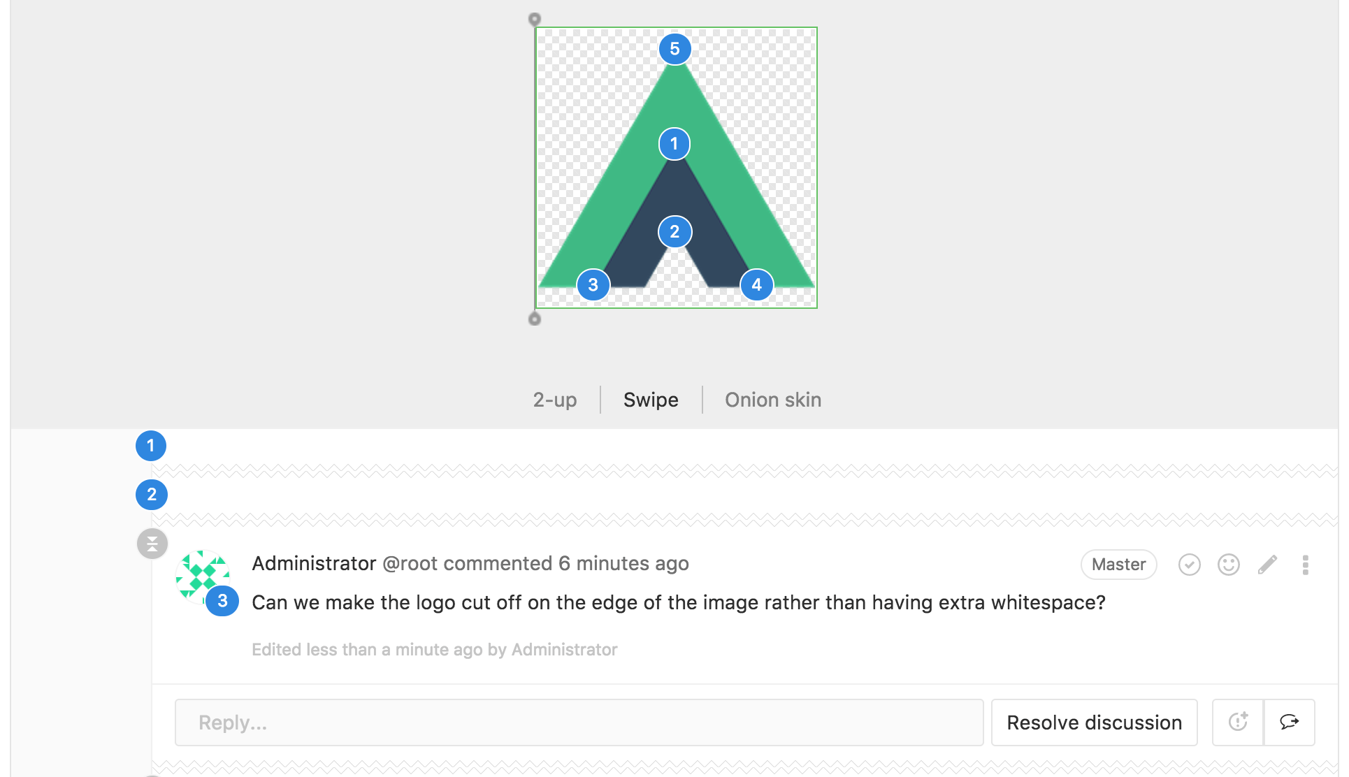 Sometimes a discussion is revolved around an image. With image discussions, you can easily target a specific coordinate of an image and start a discussion around it. Image discussions are available in merge requests and commit detail views.