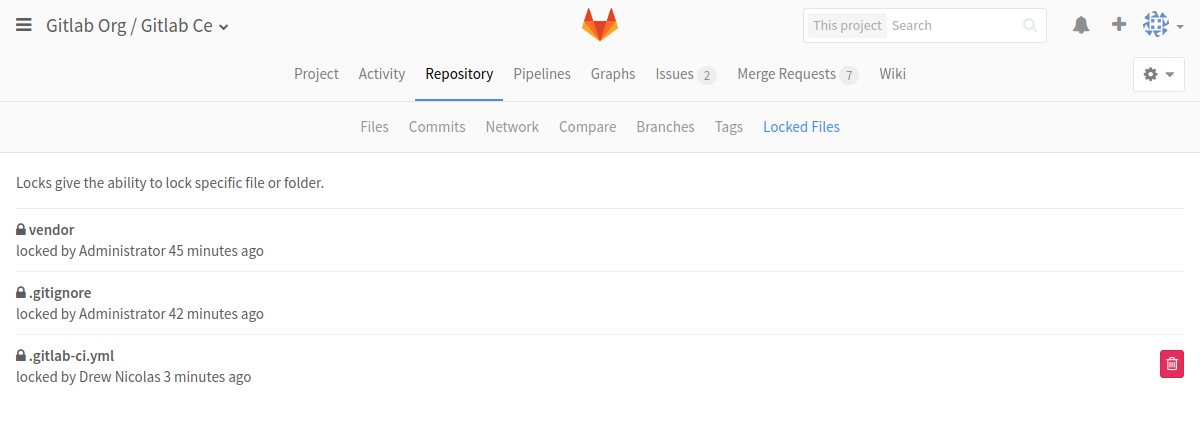 To view or manage every existing lock, navigate to the Project > Repository > Locked Files area. There, you can view all existing locks and remove the ones you have permission for.
