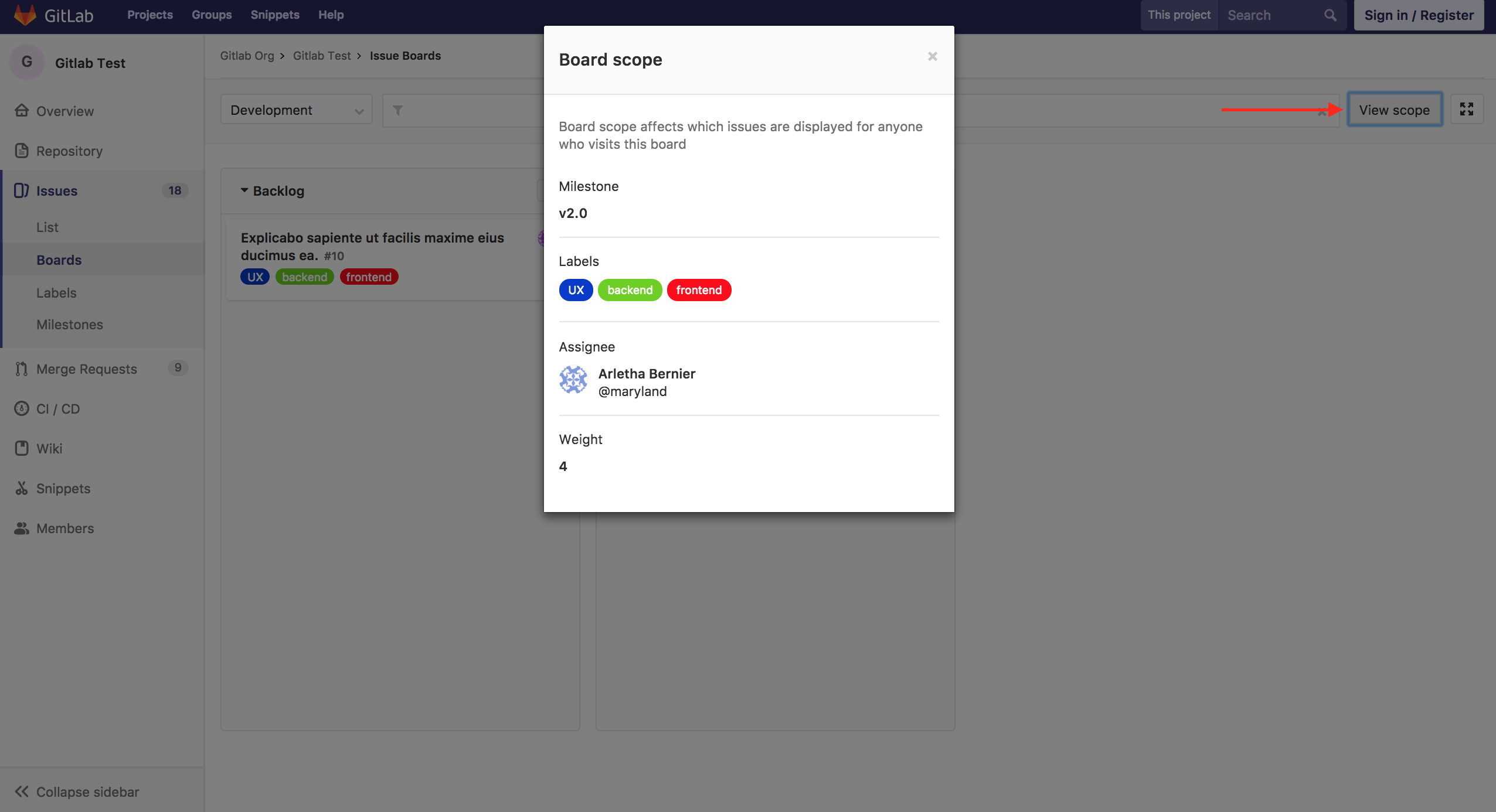 Group issue board is analogous to project-level issue board and it is accessible at the group navigation level. A group-level issue board allows you to view all issues from all projects in that group (currently, it does not see issues from projects in subgroups). Similarly, you can only filter by group labels for these boards. When updating milestones and labels for an issue through the sidebar update mechanism, again only group-level objects are available.